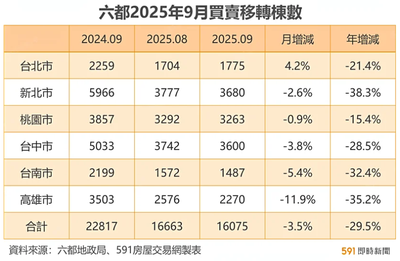根據最新官方統計,六都9月買賣移轉棟數分別為台北市1775棟,月增4.2%、年減21.4%;新北市3680棟,月減2.6%、年減38.3%;桃園市3263棟,月減0.9%,年減15.4%;台中市3600棟,月減3.8%、年減28.5%;台南市1487棟,月減5.4%,年減32.4%;高雄市2270棟,月減11.9%,年減35.2%。進一步觀察六都表現,雖然台北市呈現月增,但仍創下統計以來歷史新低量。另外,月減最慘的高雄,也一同創下統計以來歷史新低量。